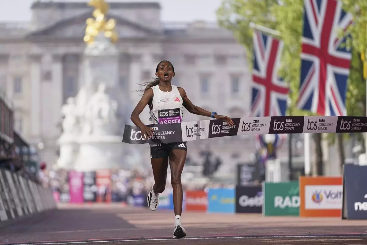 Tigst Assefa crosses the line to win the women's race at the London Marathon, Sunday, April 27, 2025. (AP Photo/Alberto Pezzali)