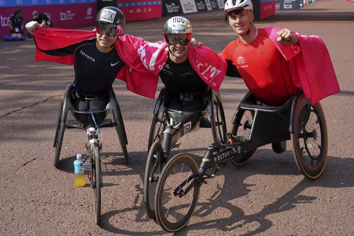 Marcel Hug, centre, of Switzerland winner of the Men's wheelchair race, with second placed Tomoki Suzuki of Japan, left and Jetze Plat of the Netherland, third, pose for photographs at the London Marathon, Sunday, April 27, 2025. (AP Photo/Alberto Pezzali)