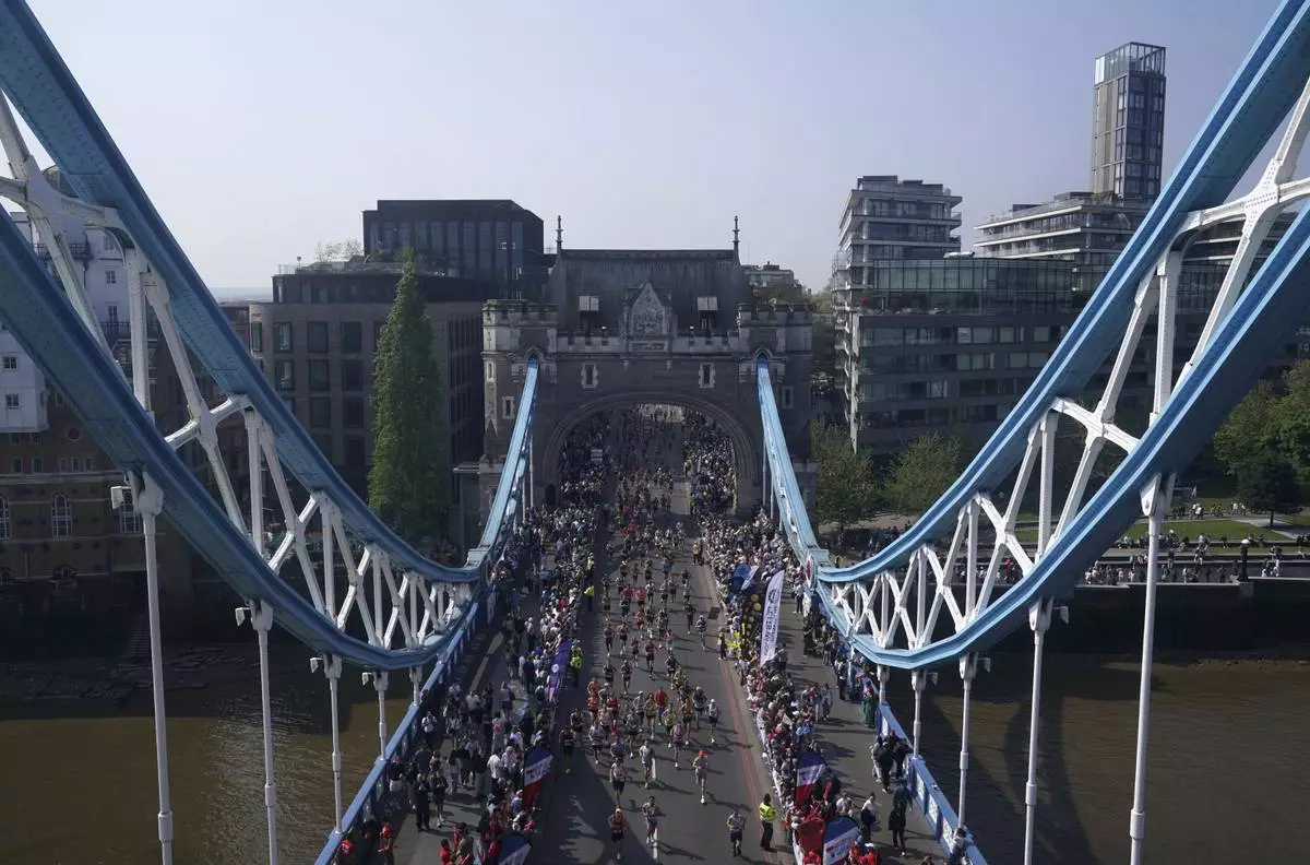 The masses cross Tower Bridge during the TCS London Marathon, Sunday April 27, 2025. (Jonathan Brady/PA via AP)