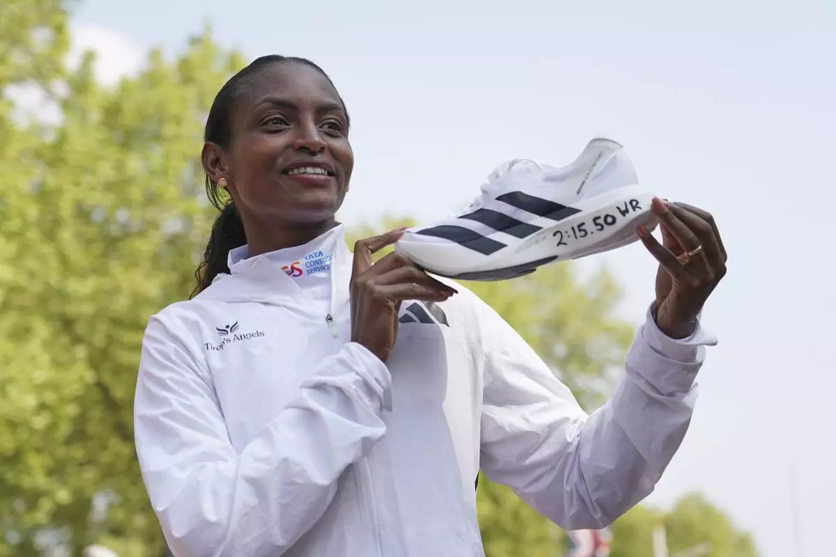 Tigst Assefa of Ethiopia poses for the cameras after setting a new women's only world record time and winning the women's race at the London Marathon, Sunday, April 27, 2025. (AP Photo/Alberto Pezzali)