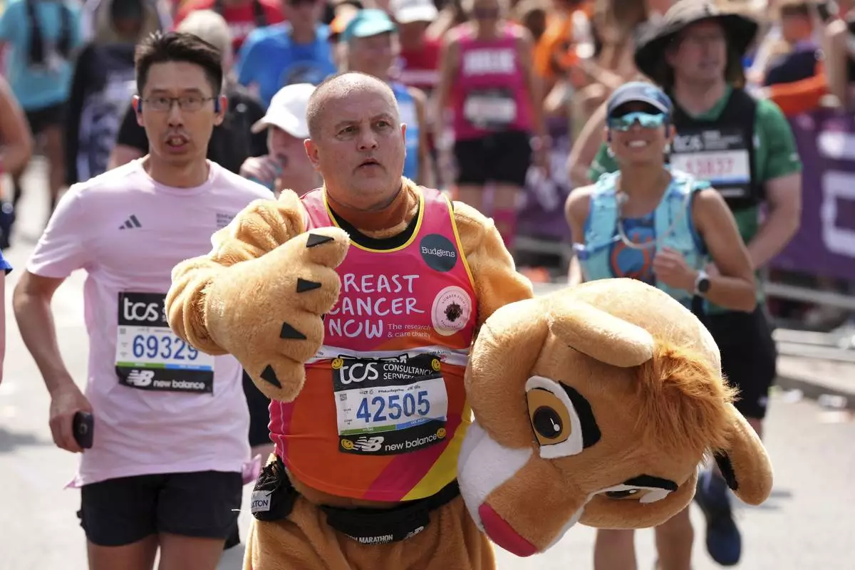 Runners cross Tower Bridge in fancy dress during the Mass Participation race of the TCS London Marathon, Sunday April 27, 2025. (Jonathan Brady/PA via AP)