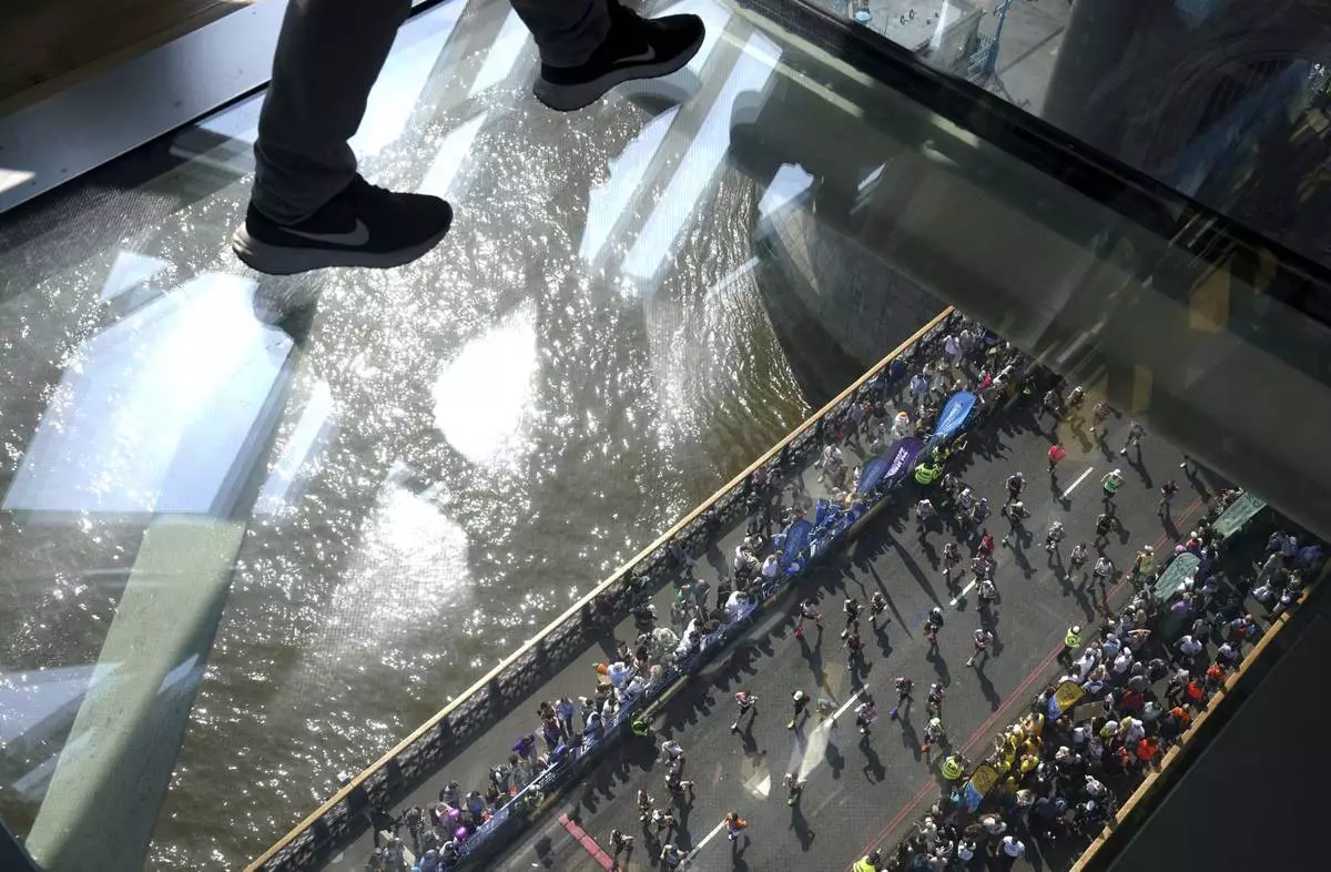 Visitors to Tower Bridge walk across the walkway as runners in the mass participation race go by during the TCS London Marathon, Sunday April 27, 2025. (Jonathan Brady/PA via AP)
