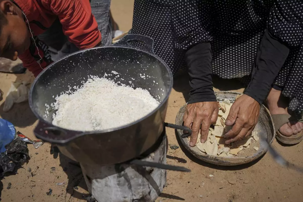The Al-Najjar family prepares for a meal of peas with rice in their family tent in Muwasi, on the outskirts of Khan Younis in the southern Gaza Strip, Friday, April, 25, 2025. (AP Photo/Abdel Kareem Hana)