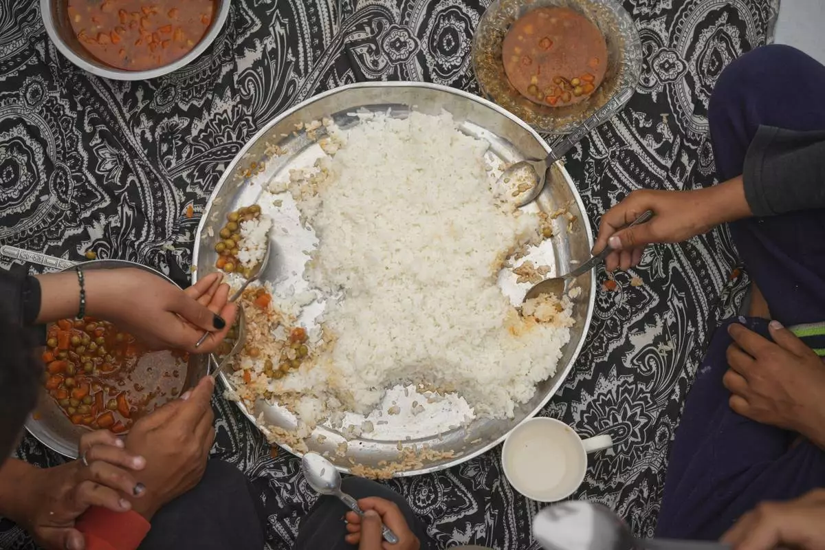 The Al-Najjar family eats peas with rice in their family tent in Muwasi, on the outskirts of Khan Younis in the southern Gaza Strip, Friday, April, 25, 2025.(AP Photo/Abdel Kareem Hana)