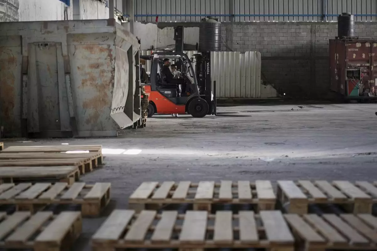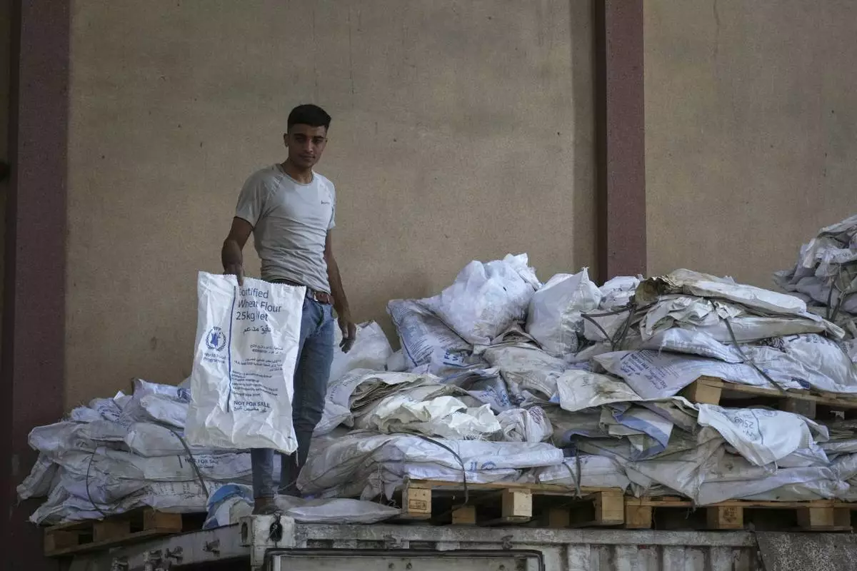 A Palestinian worker holds one of the empty sacks of flour at the World Food Program warehouse in the Nuseirat refugee camp, Gaza Strip, Saturday April 26, 2025. (AP Photo/Abdel Kareem Hana)