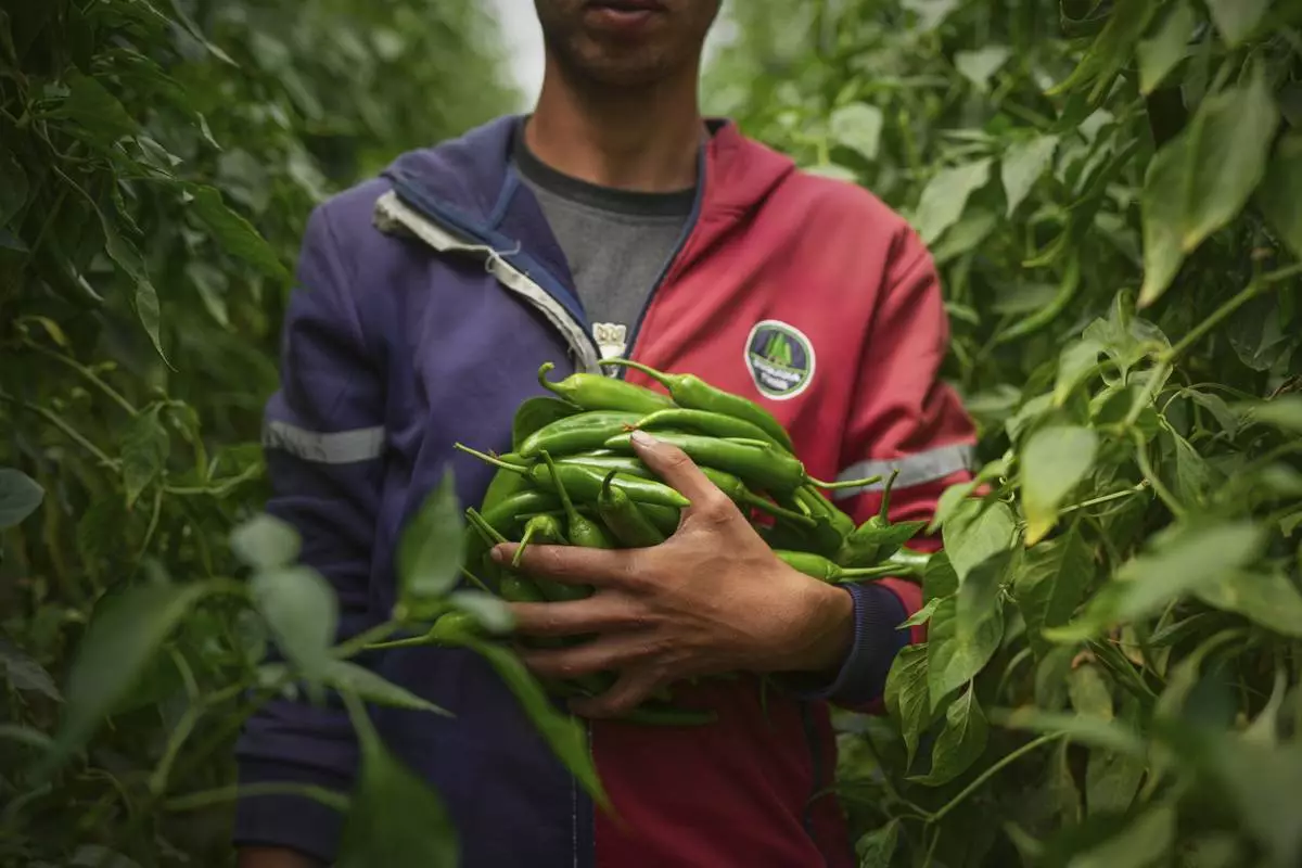 Farmer Ahmed Al-Shaer, 20, holds green chili peppers grown in a greenhouse in Khan Younis, in the southern Gaza Strip, Friday, April 25, 2025. (AP Photo/Abdel Kareem Hana)