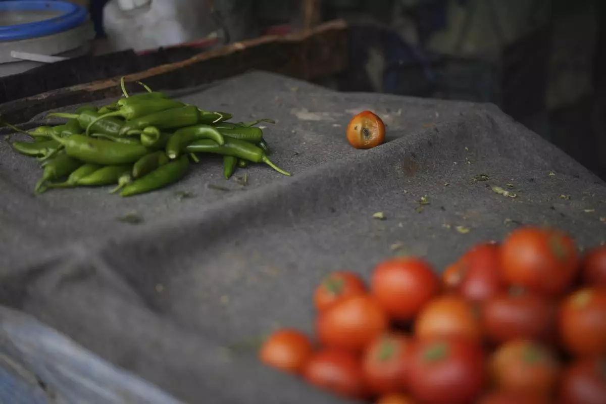 Green chili peppers are displayed for sale at an outdoor food market in Khan Younis, in the southern Gaza Strip, Thursday, April 24, 2025. (AP Photo/Abdel Kareem Hana)