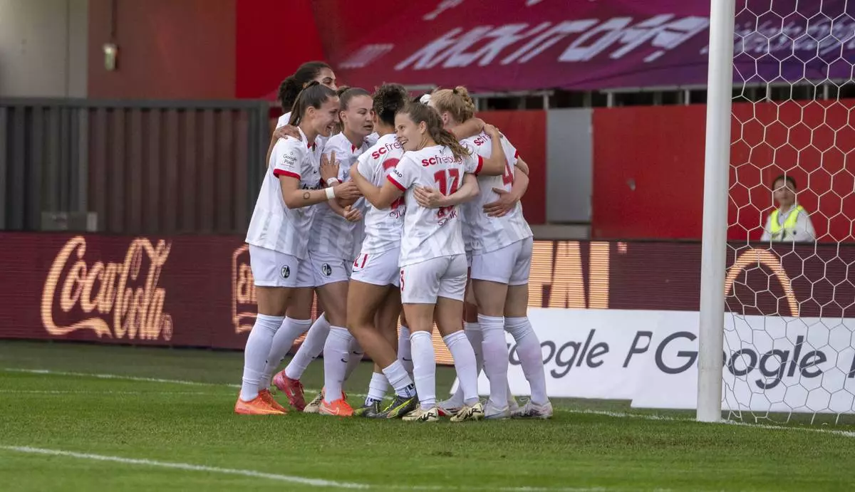 SC Freiburg players celebrate after scoring during a Women's Bundesliga soccer match against Bayern Munich in Munich, Germany, Sunday, April 27, 2025. (Leonie Asendorpf/dpa via AP)