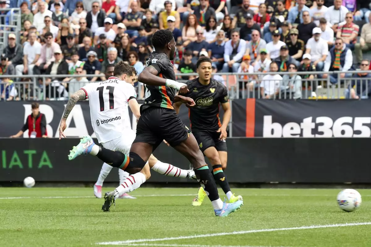 AC Milan's Christian Pulisic scores his side's opening goal during the Serie A soccer match between Venezia and AC Milan at the Pier Luigi Penzo Stadium, in Venice, Italy, Sunday, April 27, 2025. (Paola Garbuio/LaPresse via AP)