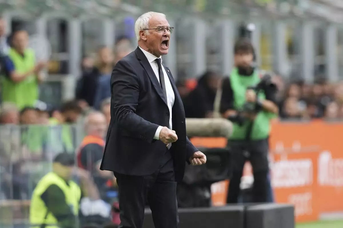 Roma's head coach Claudio Ranieri reacts during the Serie A soccer match between Inter Milan and Roma at the San Siro Stadium, in Milan, Italy, Sunday, April 27, 2025. (AP Photo/Antonio Calanni)