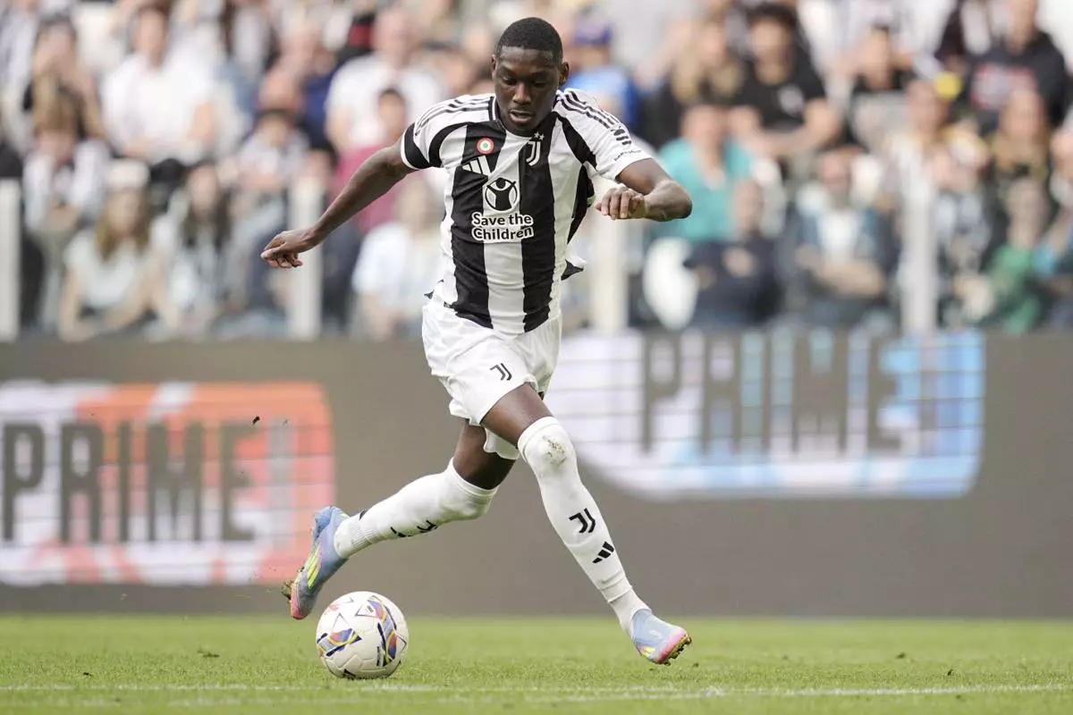 Juventus' Randal Kolo Muani scores his side's second goal during the during the Serie A soccer match between Juventus and Monza at the Allianz Stadium in Turin, Italy, Sunday, April 27, 2025. (Marco Alpozzi/LaPresse via AP)