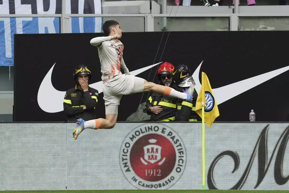 Roma's Matias Soule, right, celebrates scoring his side's opening goal during the Serie A soccer match between Inter Milan and Roma at the San Siro Stadium, in Milan, Italy, Sunday, April 27, 2025. (AP Photo/Antonio Calanni)