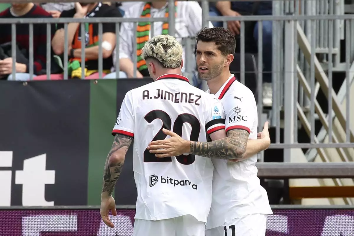 AC Milan's Christian Pulisic, right, celebrates scoring his side's opening goal during the Serie A soccer match between Venezia and AC Milan at the Pier Luigi Penzo Stadium, in Venice, Italy, Sunday, April 27, 2025. (Paola Garbuio/LaPresse via AP)