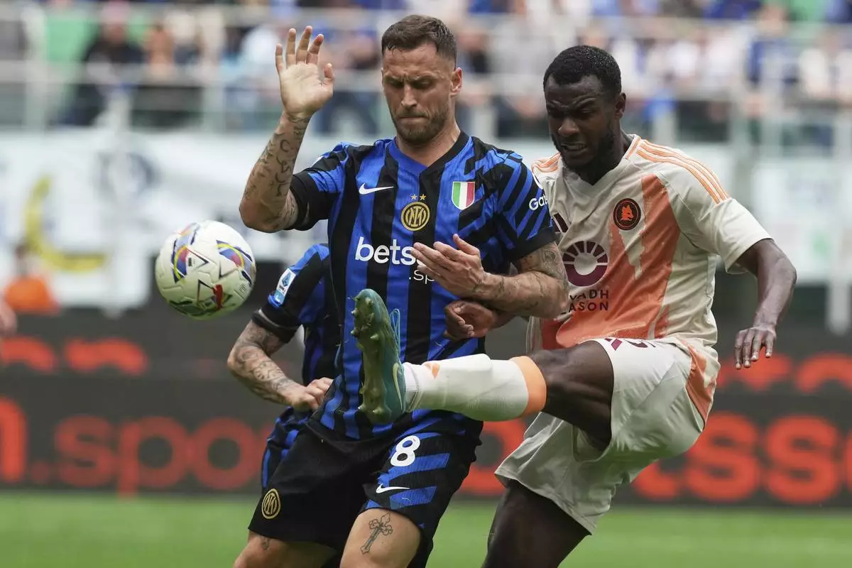 Roma's Evan Ndicka, right, challenges Inter Milan's Marko Arnautovic during the Serie A soccer match between Inter Milan and Roma at the San Siro Stadium, in Milan, Italy, Sunday, April 27, 2025. (AP Photo/Antonio Calanni)
