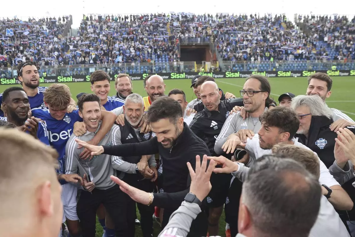 Como's coach Cesc Fabregas, center, celebrates his side's 1-0 win at the end of the Serie A soccer match between Como and Genoa at the Giuseppe Sinigaglia stadium in Como, Italy, Sunday April 27 2025. (Antonio Saia/LaPresse via AP)