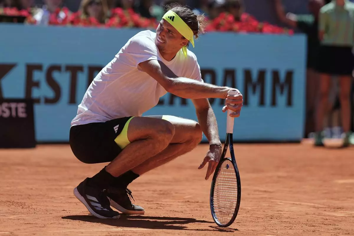 Alexander Zverev of Germany reacts during his Madrid Open round of 32 tennis match against Alejandro Davidovich Fokina of Spain, in Madrid, Spain, Sunday, April 27, 2025. (AP Photo/Manu Fernandez)