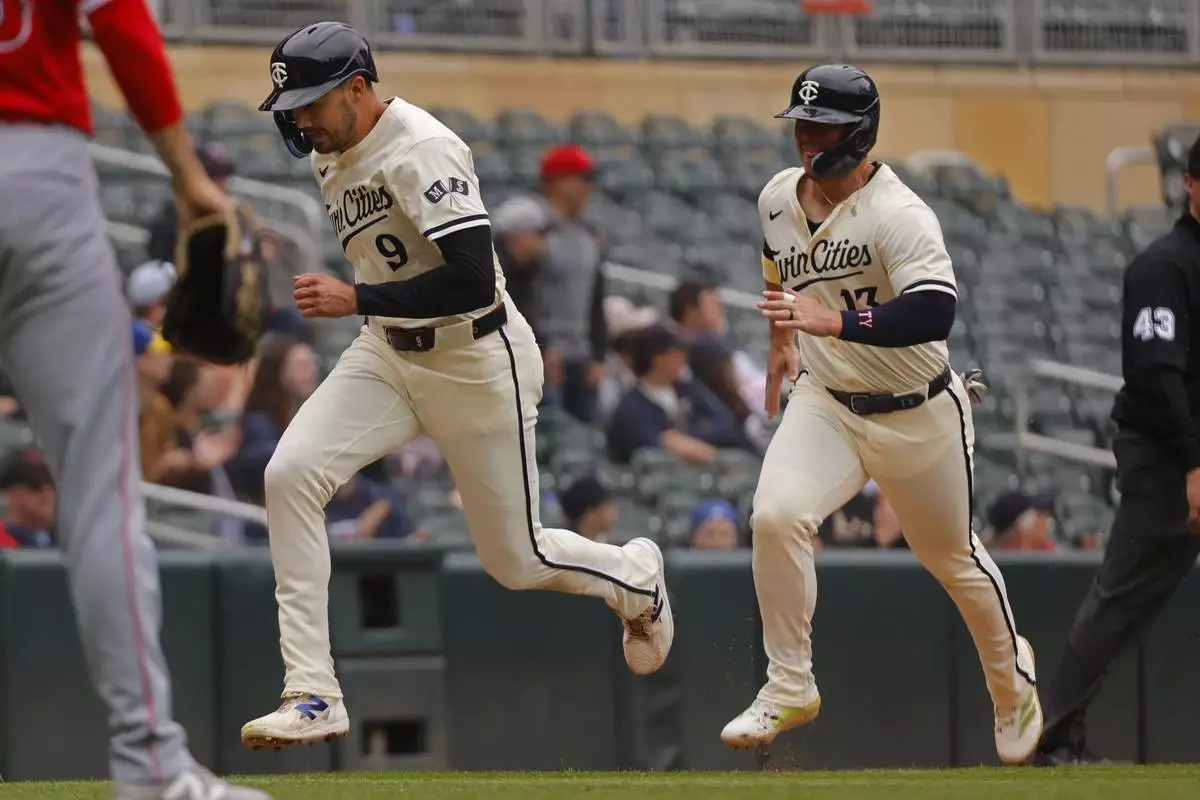 Minnesota Twins' Trevor Larnach (9) and Ty France (13) score on a double by Ryan Jeffers against the Los Angeles Angels in the sixth inning of a baseball game Sunday, April 27, 2025, in Minneapolis. (AP Photo/Bruce Kluckhohn)