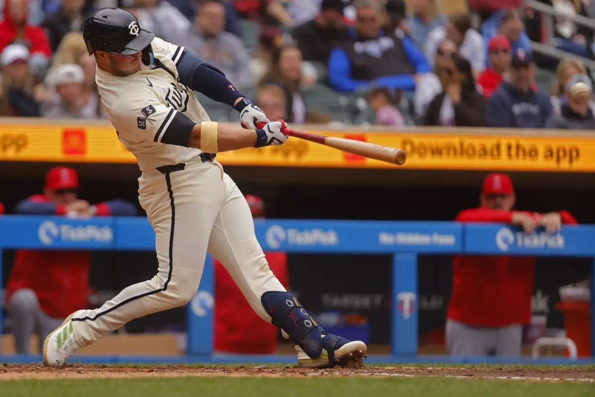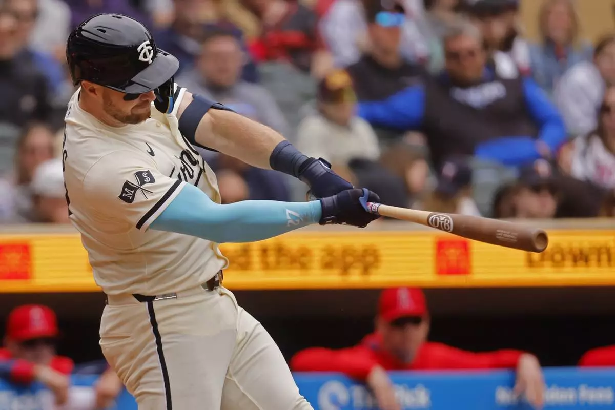 Minnesota Twins' Ryan Jeffers hits a two-RBI double against the Los Angeles Angels in the sixth inning of a baseball game Sunday, April 27, 2025, in Minneapolis. (AP Photo/Bruce Kluckhohn)