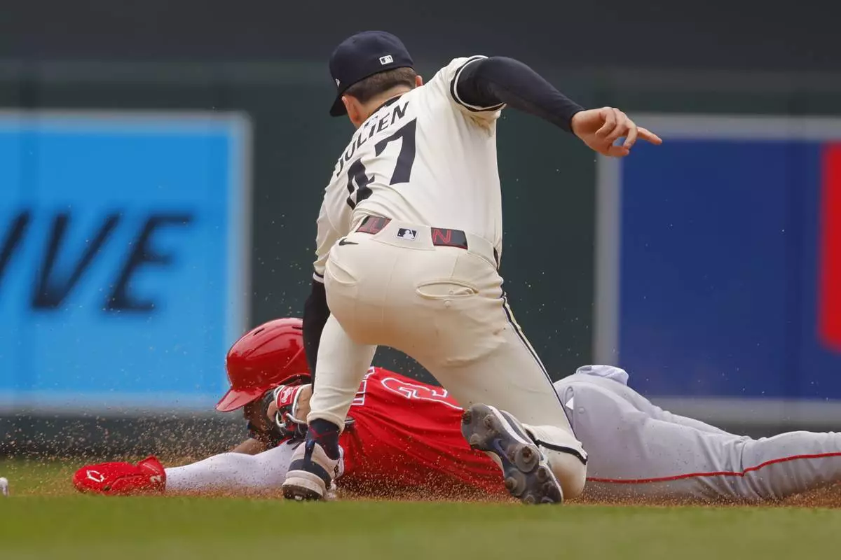 Minnesota Twins second baseman Edouard Julien (47) tags out Los Angeles Angels' Luis Rengifo, bottom on a stolen base-attempt in the fifth inning of a baseball game Sunday, April 27, 2025, in Minneapolis. (AP Photo/Bruce Kluckhohn)