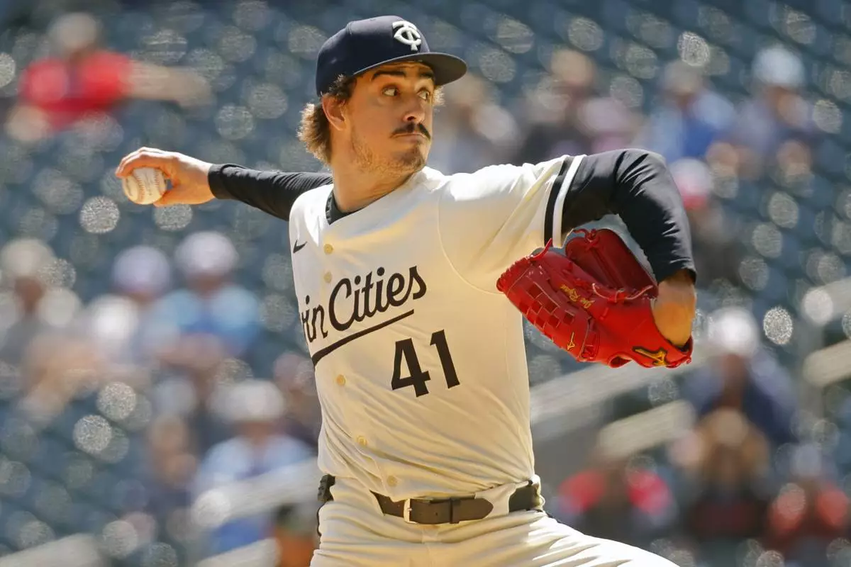 Minnesota Twins starting pitcher Joe Ryan throws to the Los Angeles Angels in the first inning of a baseball game Sunday, April 27, 2025, in Minneapolis. (AP Photo/Bruce Kluckhohn)