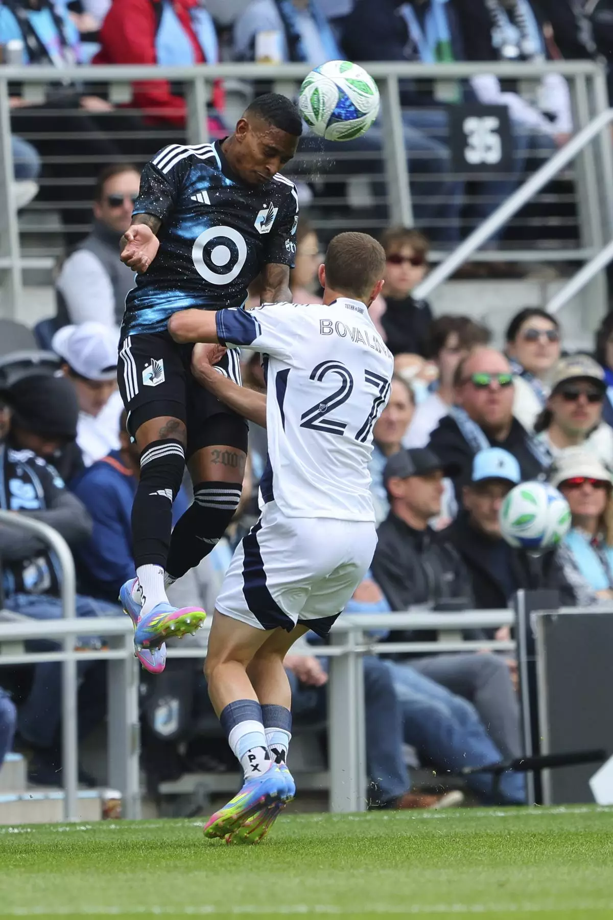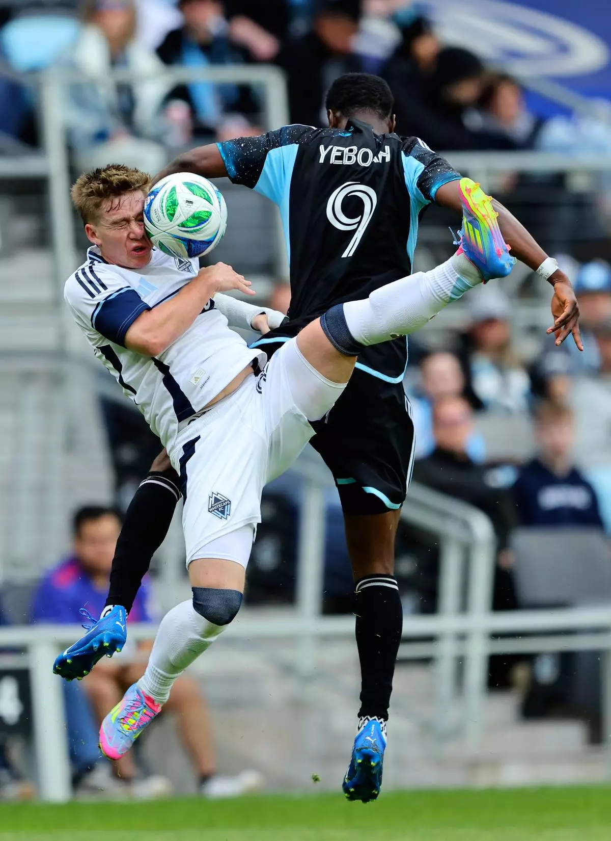 Vancouver Whitecaps defender Tate Johnson, left, takes the ball to his face while Minnesota United forward Kelvin Yeboah (9) defends during the second half of an MLS soccer match on Sunday, April 27, 2025, in St. Paul, Minn. (AP Photo/Adam Bettcher)