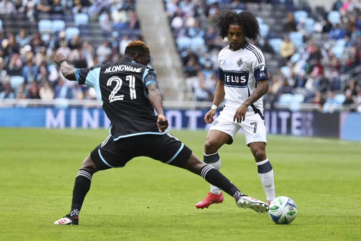 Minnesota United forward Bongokuhle Hlongwane (21) blocks a pass by Vancouver Whitecaps forward Jayden Nelson (7) during the first half of an MLS soccer match Sunday, April 27, 2025, in St. Paul, Minn. (AP Photo/Adam Bettcher)