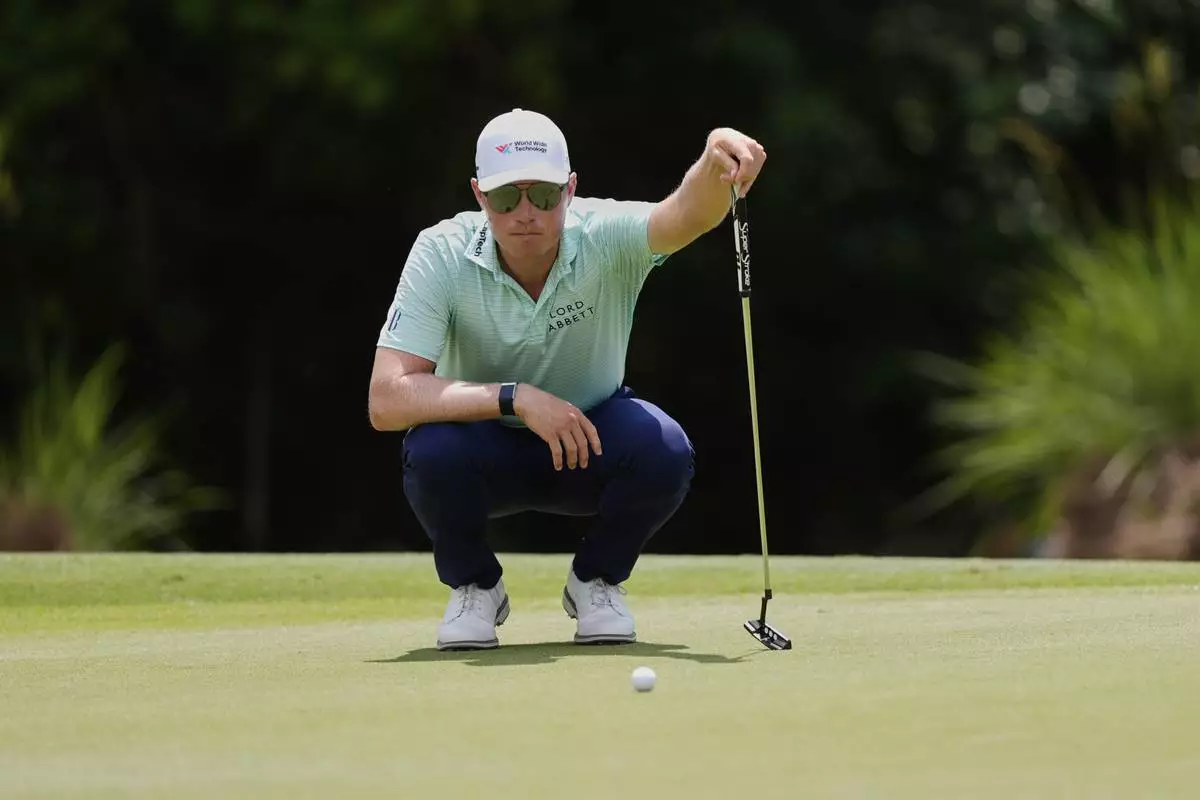 Ben Griffin lines up a shot on the 4th green during the final round of the PGA Zurich Classic golf tournament at TPC Louisiana in Avondale, La., Sunday, April 27, 2025. (AP Photo/Gerald Herbert)