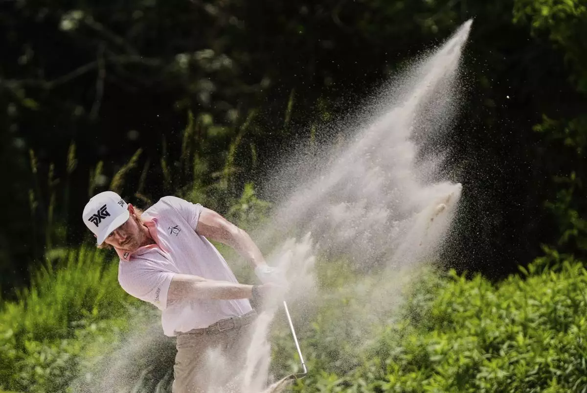 Jake Knapp hits out of the sand on the 5th fairway during the final round of the PGA Zurich Classic golf tournament at TPC Louisiana in Avondale, La., Sunday, April 27, 2025. (AP Photo/Gerald Herbert)