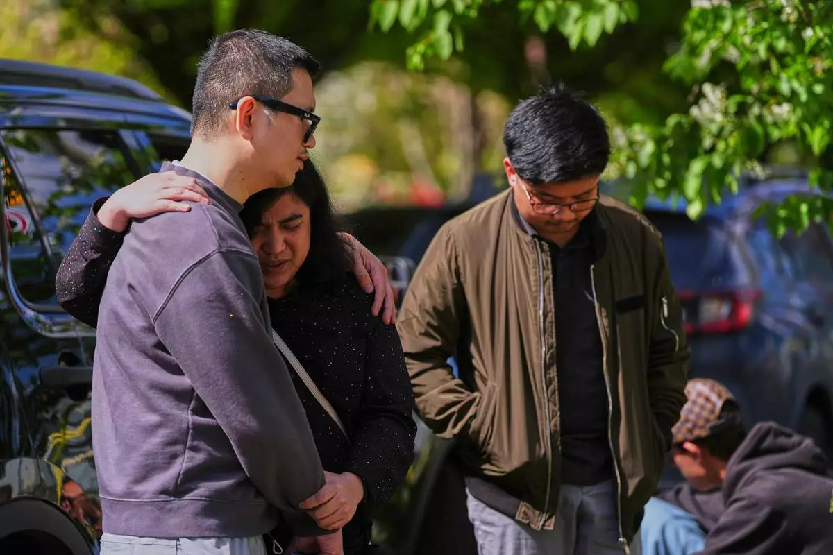 People comfort each other near the scene the day after a driver killed multiple people during a Filipino community festival Sunday, April 27, 2025, in Vancouver, British Columbia. (AP Photo/Lindsey Wasson)