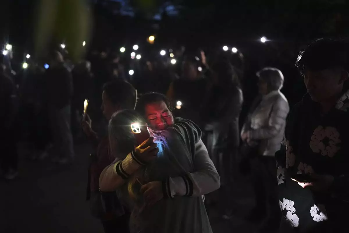 From left, Glenda Ahyeng, sister Liza Ahyeng and Shane Ahyeng hold cell phone lights during a vigil for victims after a vehicle drove into a crowd during a Filipino heritage festival in Vancouver, British Columbia, Sunday, April 27, 2025. (AP Photo/Lindsey Wasson)