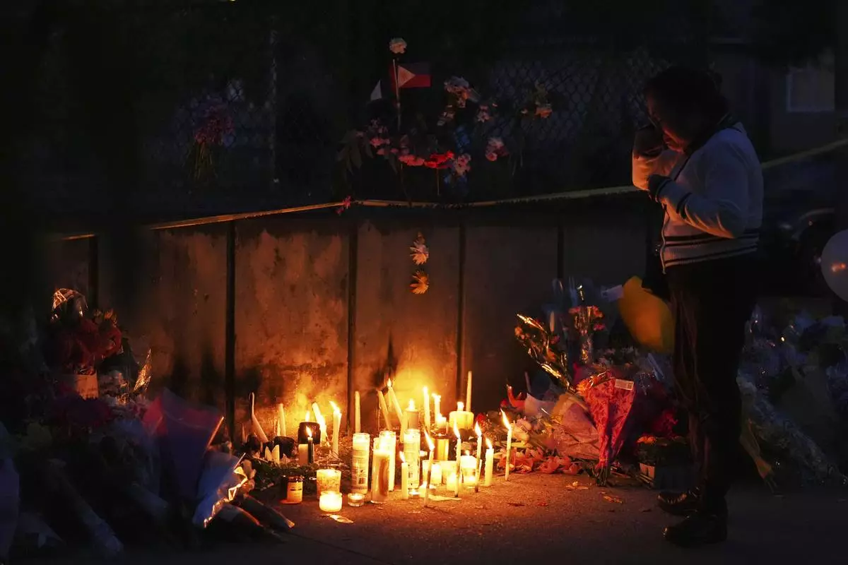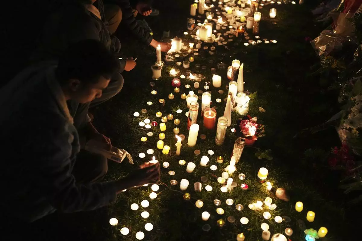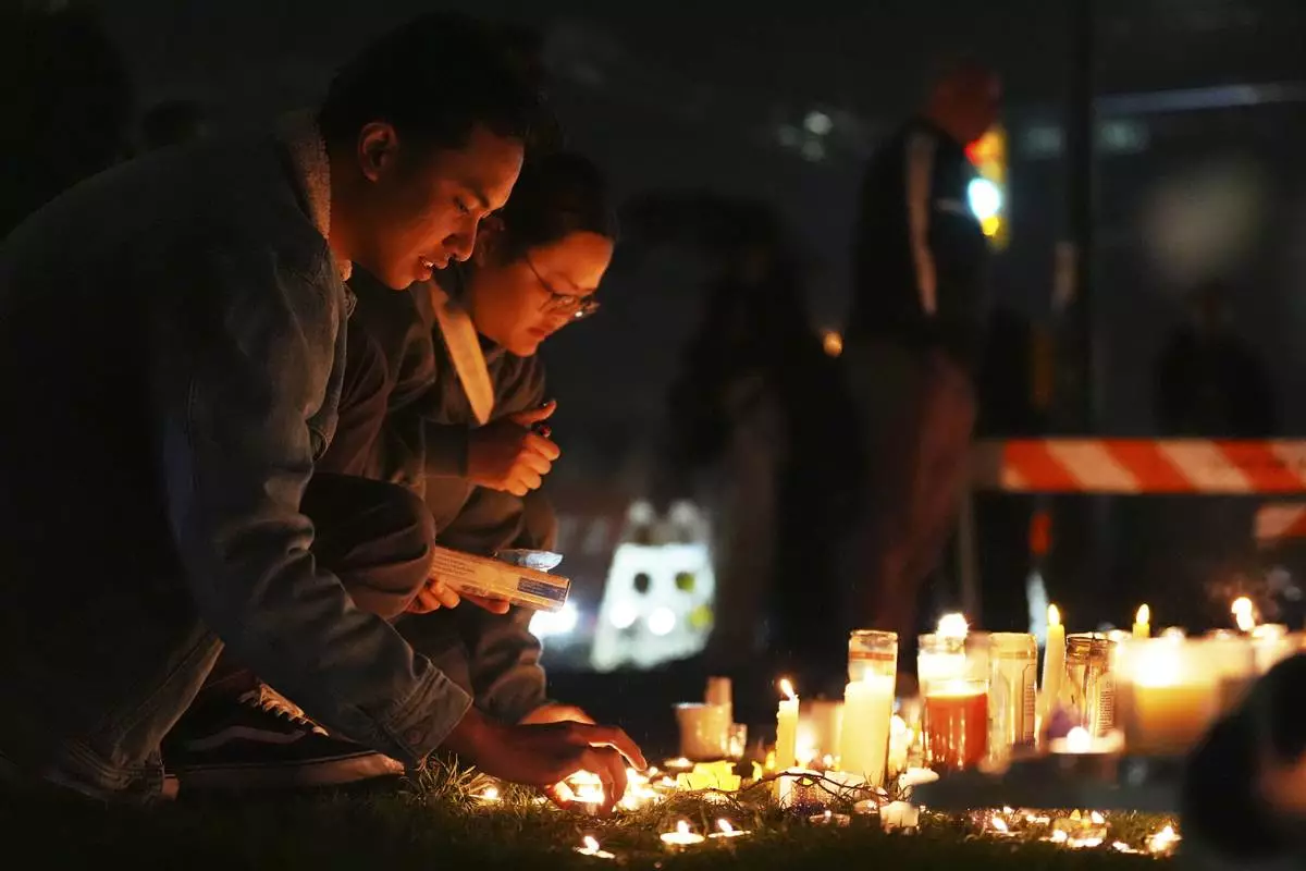 A woman lights a candle at a memorial site Sunday, April 27, 2025, near where a car drove through a crowd during a Lapu Lapu Day festival in Vancouver, British Columbia. (Rich Lam/The Canadian Press via AP)