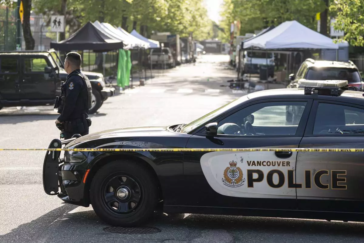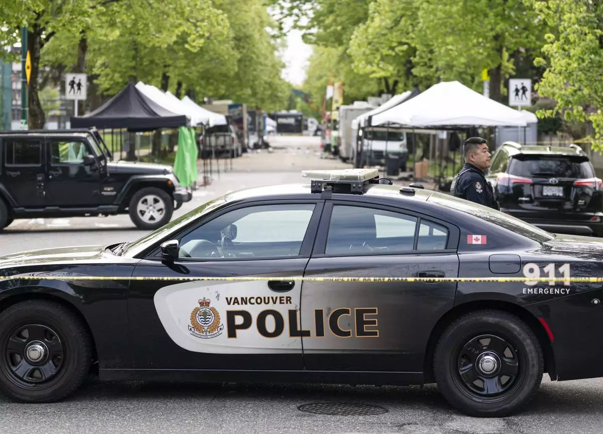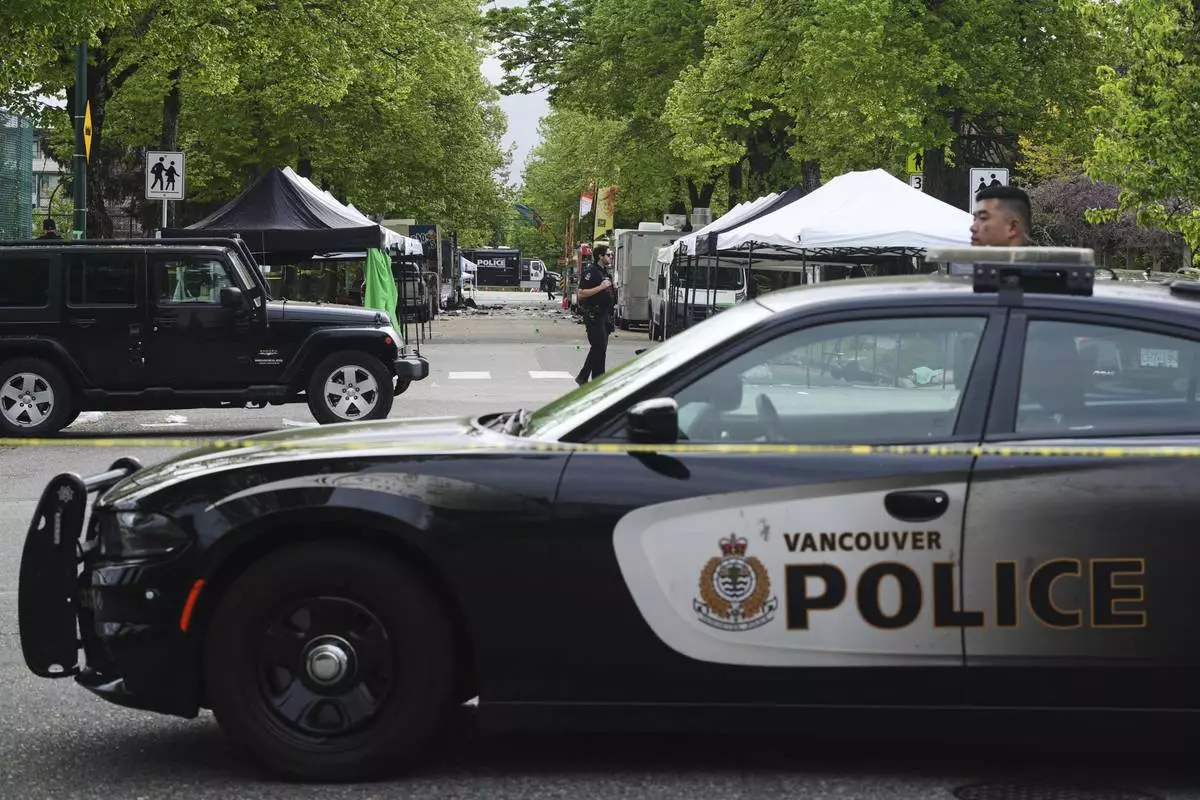 A Vancouver Police vehicle blocks the street leading the location where a vehicle drove into crowd, at a street festival last night, in Vancouver on Sunday April 27, 2025. (Rich Lam/The Canadian Press via AP)