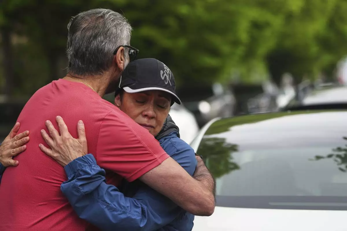 A couple hugs near the scene the day after a driver killed multiple people during a Filipino community festival Sunday, April 27, 2025, in Vancouver, British Columbia. (AP Photo/Lindsey Wasson)
