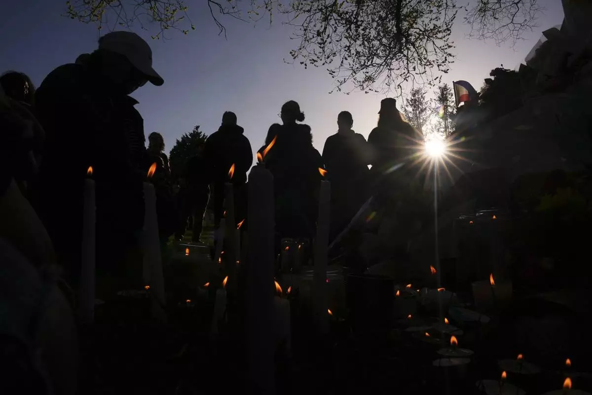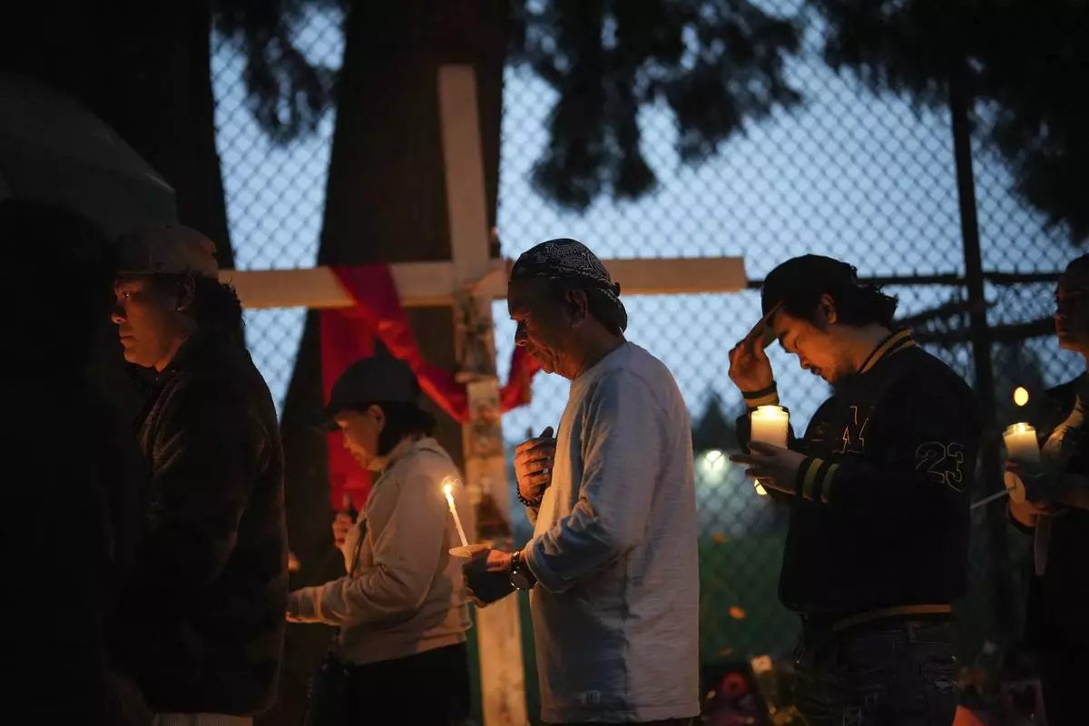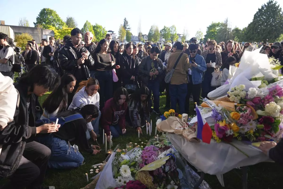 Attendees pay their respects during a vigil at Kensington Park after a vehicle drove into a crowd during a Filipino heritage festival in Vancouver, British Columbia, Sunday, April 27, 2025. (AP Photo/Lindsey Wasson)