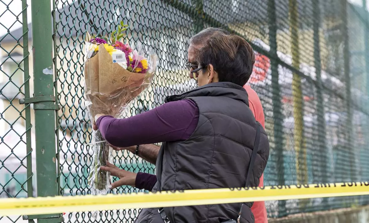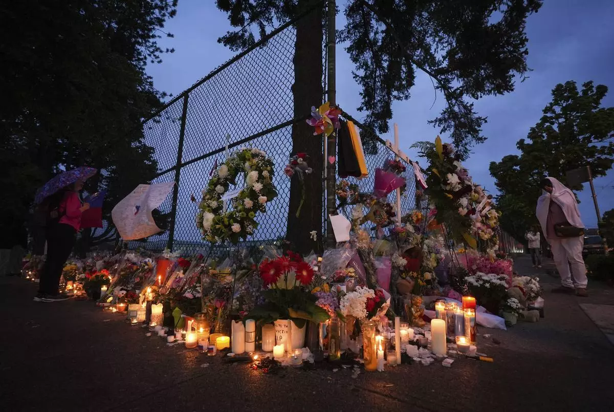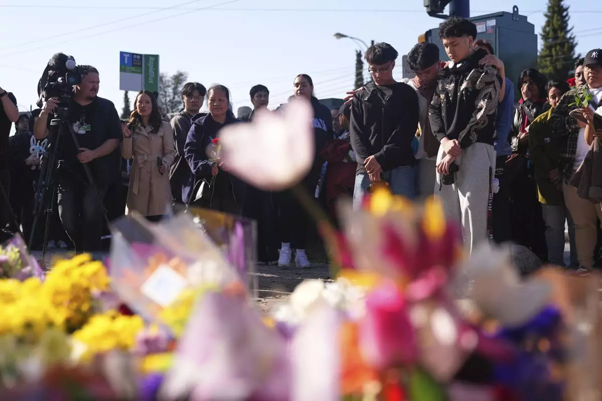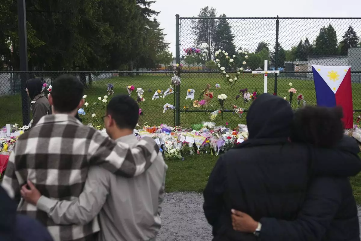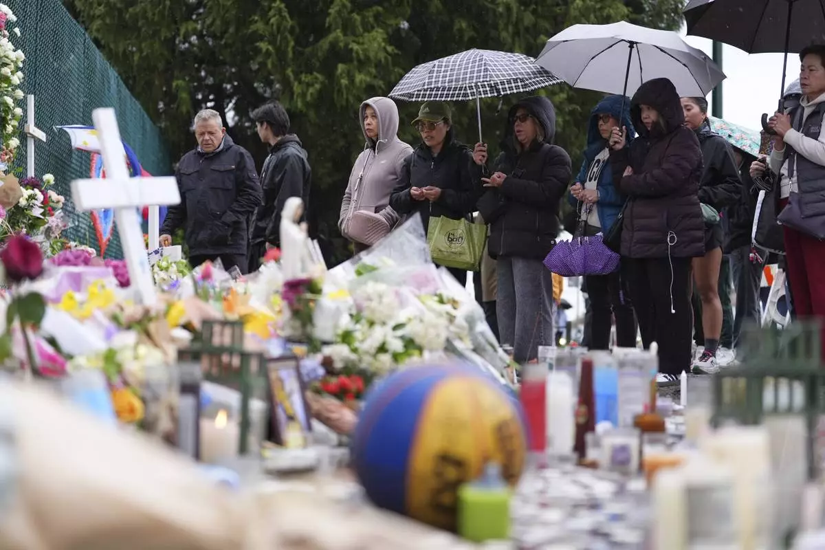Visitors stand near a growing memorial the day after a driver killed multiple people during a Filipino community festival Sunday, April 27, 2025, in Vancouver, British Columbia. (AP Photo/Lindsey Wasson)