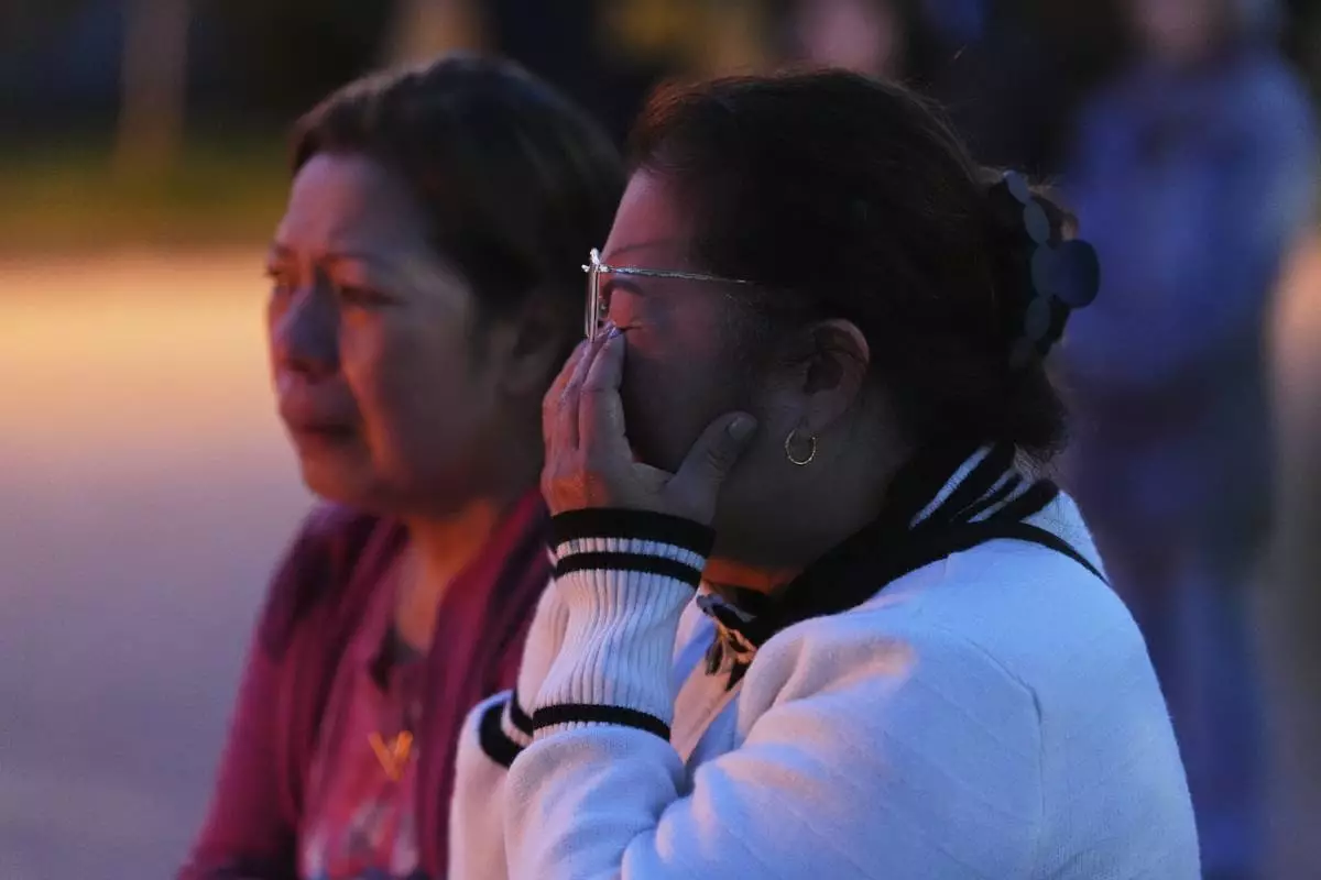 Dimples Lao, left, huddles with Filipino friends near where a vehicle drove into a crowd during a Filipino heritage festival in Vancouver, British Columbia, Monday, April 28, 2025. (AP Photo/Lindsey Wasson)