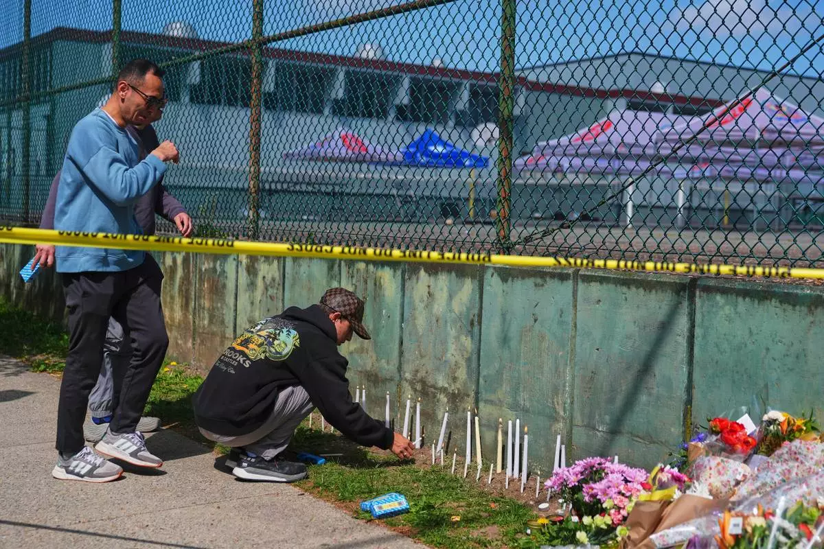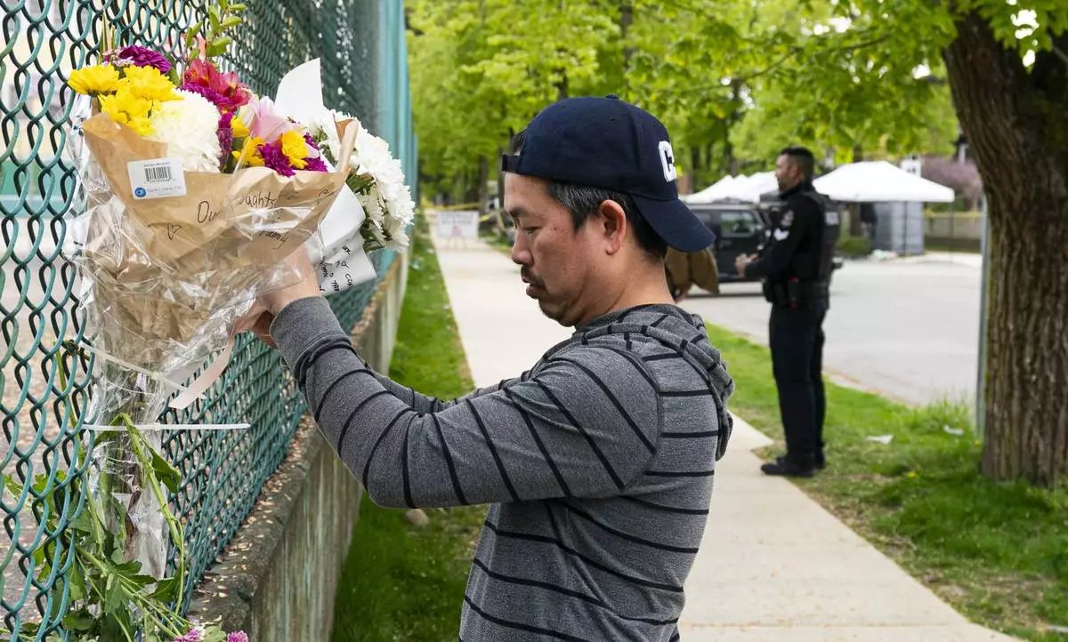 A man leaves flowers on a fence, near the location where a vehicle drove into crowd at a street festival last night, in Vancouver, British Columbia, Sunday April 27, 2025. (Rich Lam/The Canadian Press via AP)