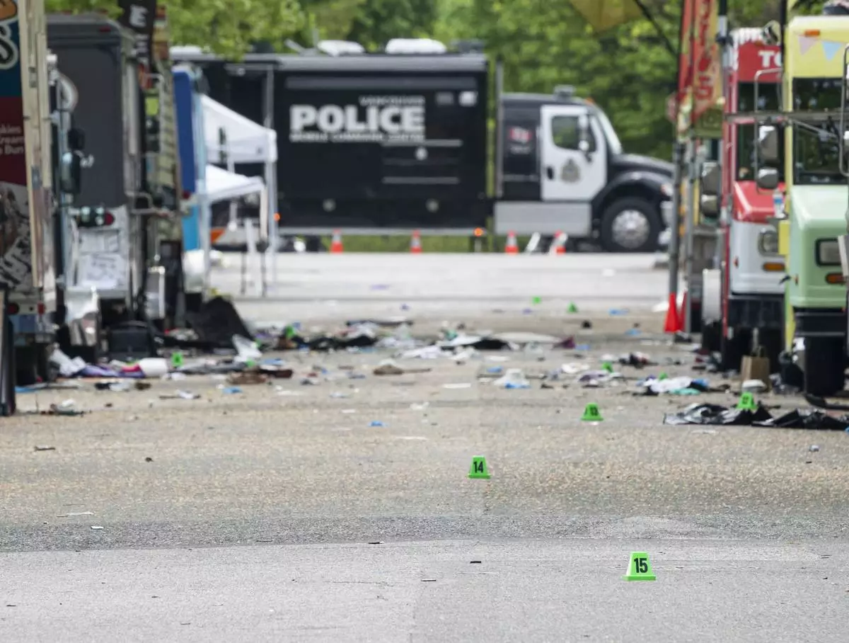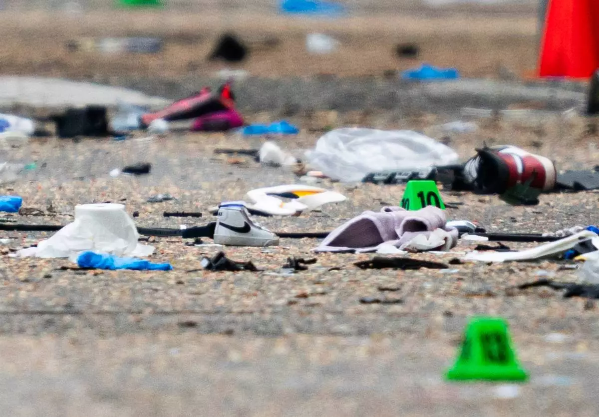 A small shoe lies among the debris and evidence markers on the street while police investigate after a vehicle drove into a crowd Saturday killing multiple people at a street festival, in Vancouver, British Columbia, Sunday, April 27, 2025. (Rich Lam/The Canadian Press via AP)