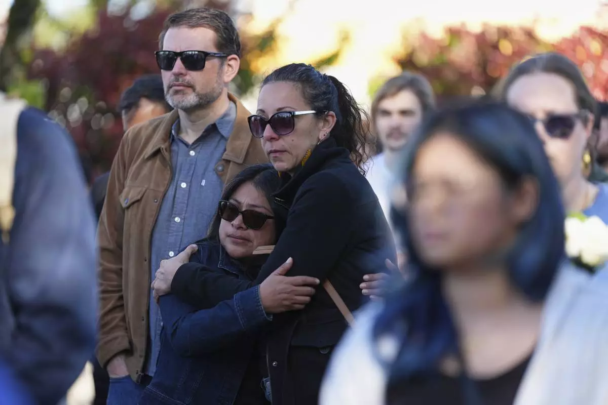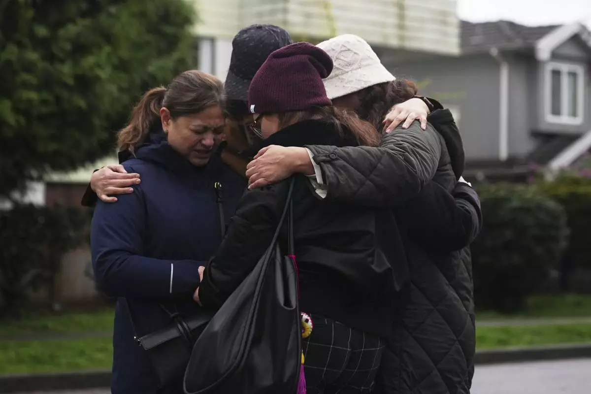 Liza Ahyeng, center right, hugs another attendee at a vigil for victims after a vehicle drove into a crowd during a Filipino heritage festival in Vancouver, British Columbia, Sunday, April 27, 2025. (AP Photo/Lindsey Wasson)