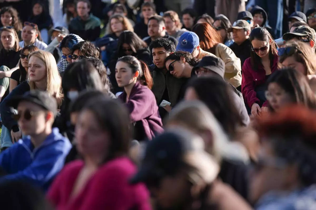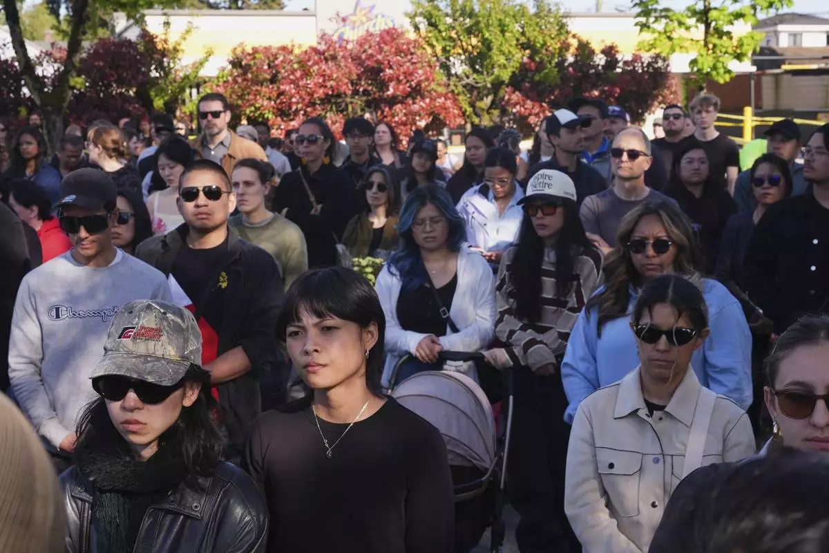 People listen to community members speak during a vigil for the victims after a vehicle drove into a crowd Saturday and killed multiple people at a Filipino heritage festival, in Vancouver, British Columbia, Sunday, April 27, 2025. (Darryl Dyck/The Canadian Press via AP)