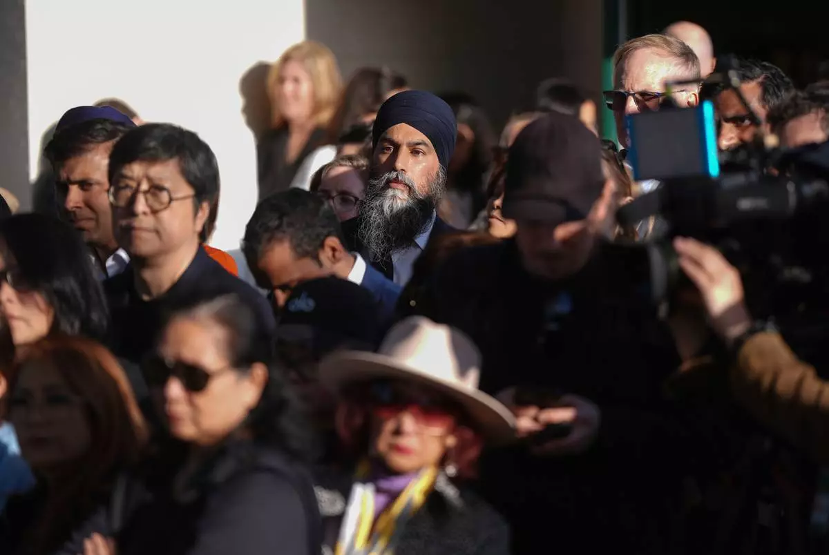 NDP Leader Jagmeet Singh stands in the crowd while listening to community members speak during a vigil for the victims after a vehicle drove into a crowd Saturday and killed multiple people at a Filipino heritage festival, in Vancouver, British Columbia, Sunday, April 27, 2025. (Darryl Dyck/The Canadian Press via AP)