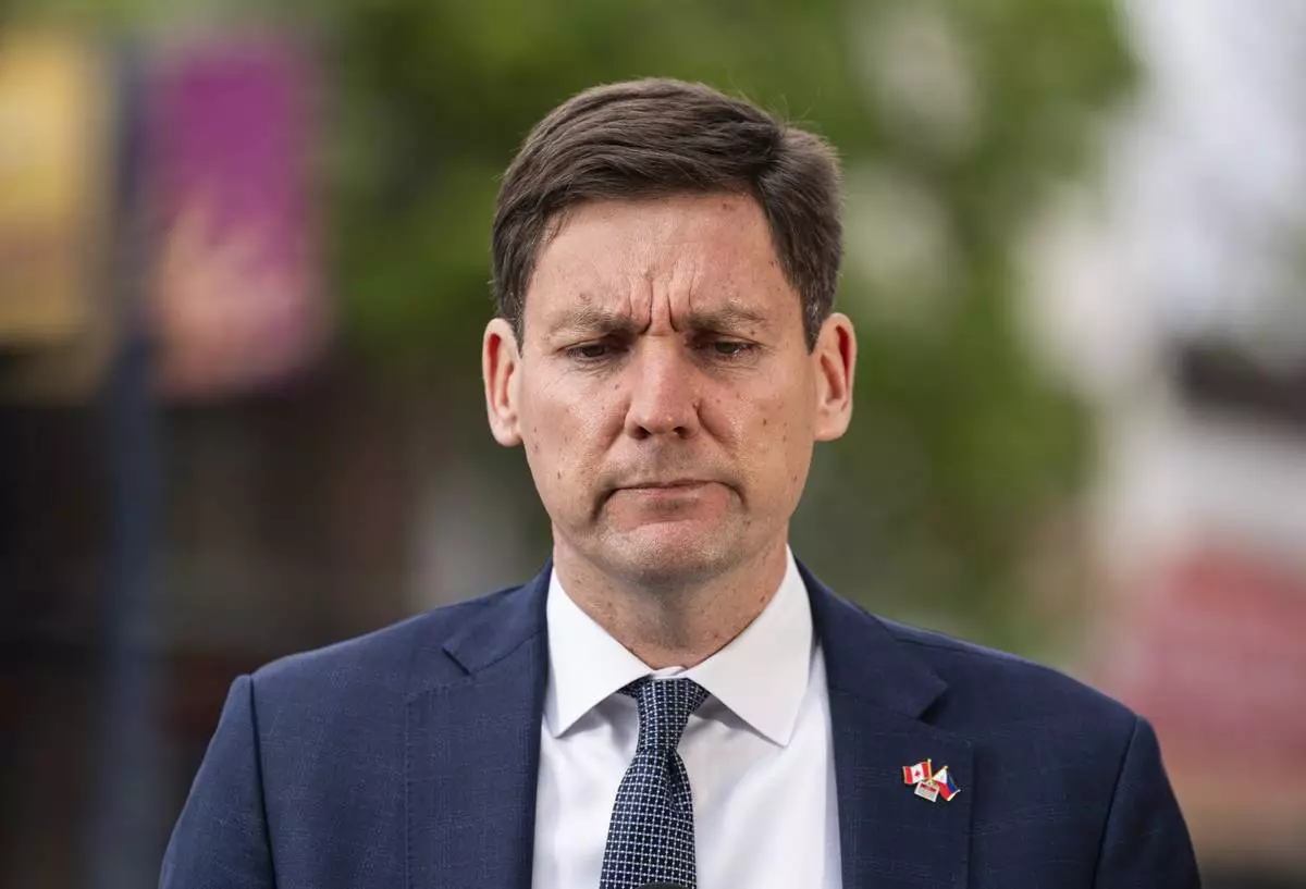 British Columbia Premier David Eby, left, delivers remarks after a vehicle drove into crowd during a Lapu Lapu Day festival in Vancouver, British Columbia, Sunday, April 27, 2025. (Rich Lam/The Canadian Press via AP)
