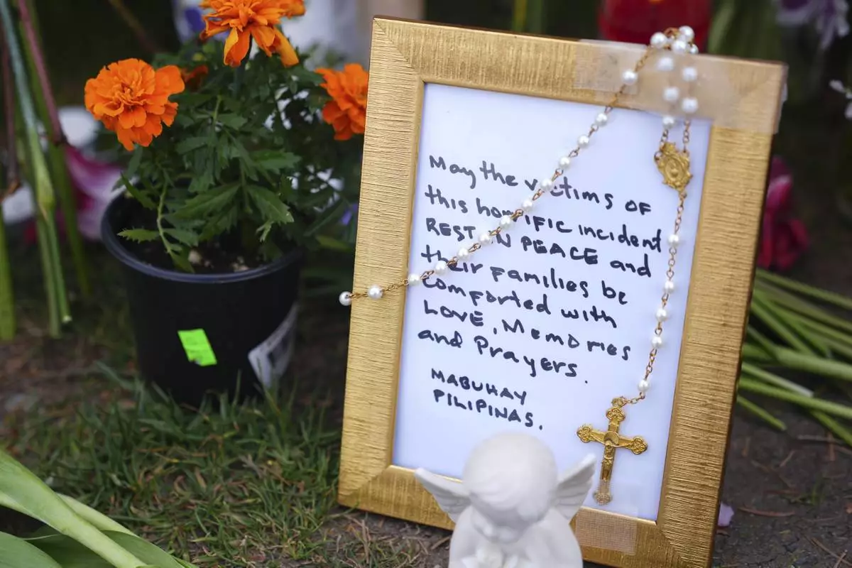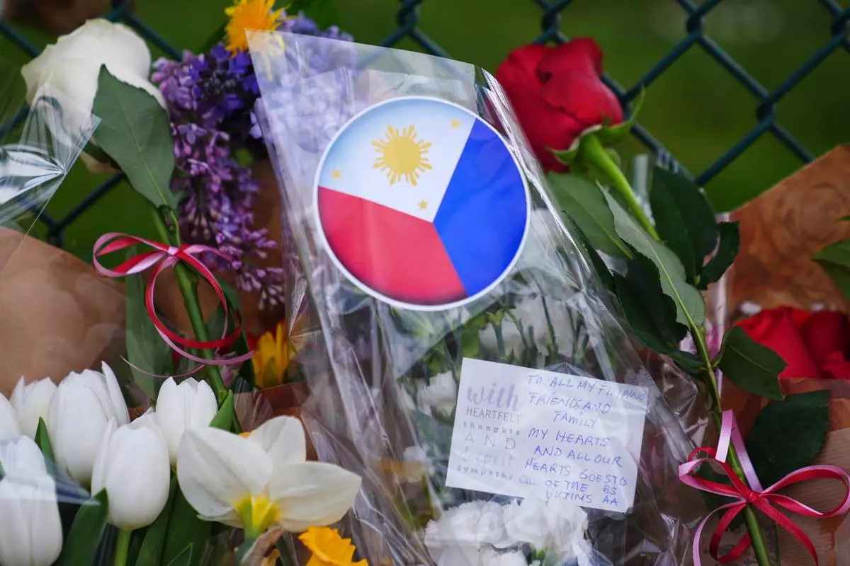 A handwritten note is seen near flowers and the flag of the Philippines at a growing memorial the day after a driver killed multiple people during a Filipino community festival Sunday, April 27, 2025, in Vancouver, British Columbia. (AP Photo/Lindsey Wasson)