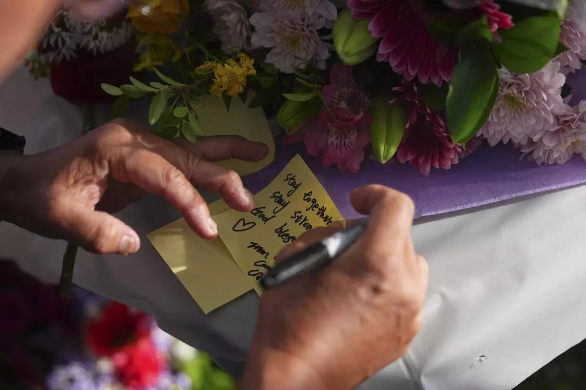 Vincent Meng writes a note at a vigil at Kensington Park after a vehicle drove into a crowd during a Filipino heritage festival in Vancouver, British Columbia, Sunday, April 27, 2025. (AP Photo/Lindsey Wasson)