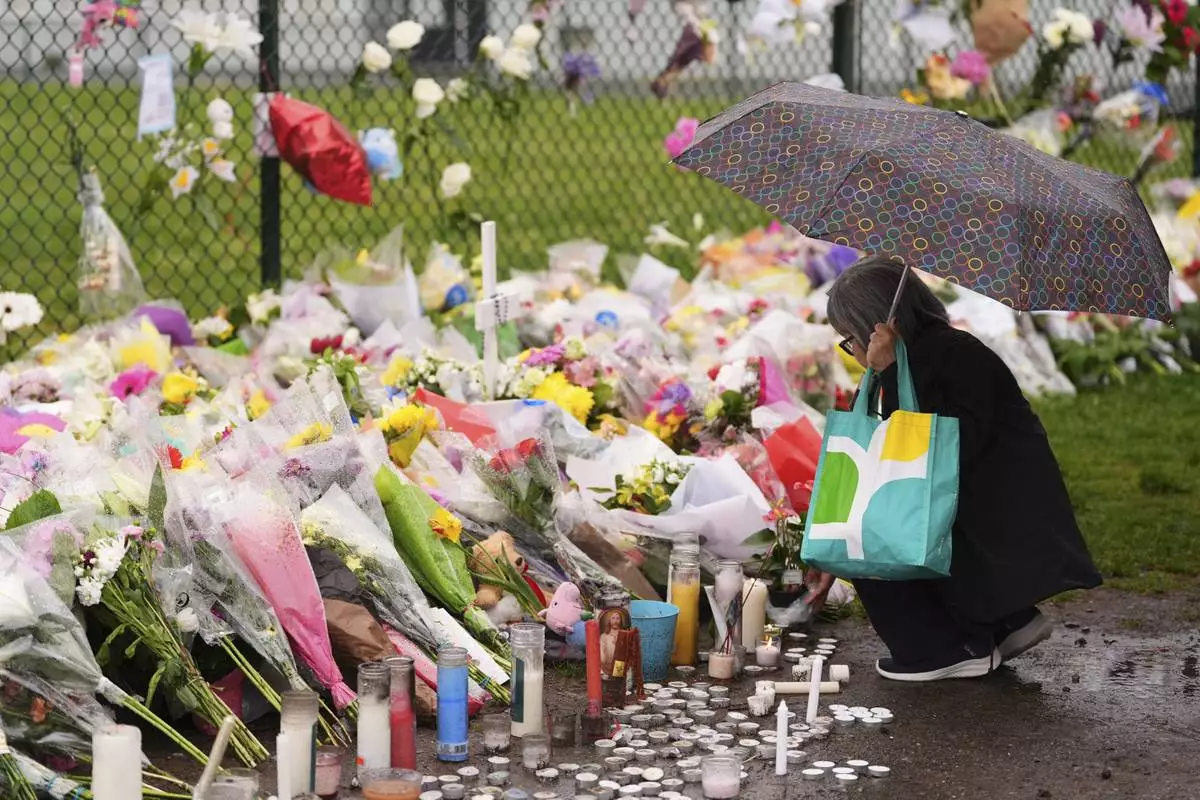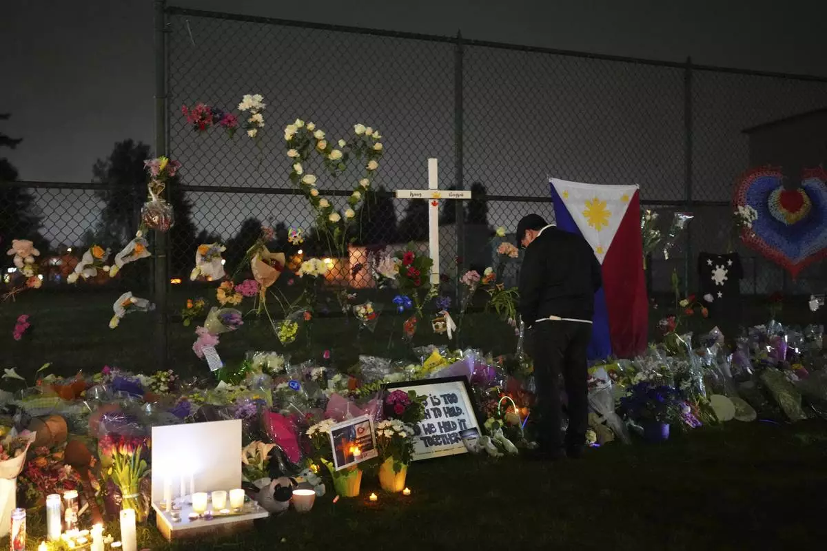 Attendees visit a memorial for victims after a vehicle drove into a crowd during a Filipino heritage festival in Vancouver, British Columbia, Monday, April 28, 2025. (AP Photo/Lindsey Wasson)
