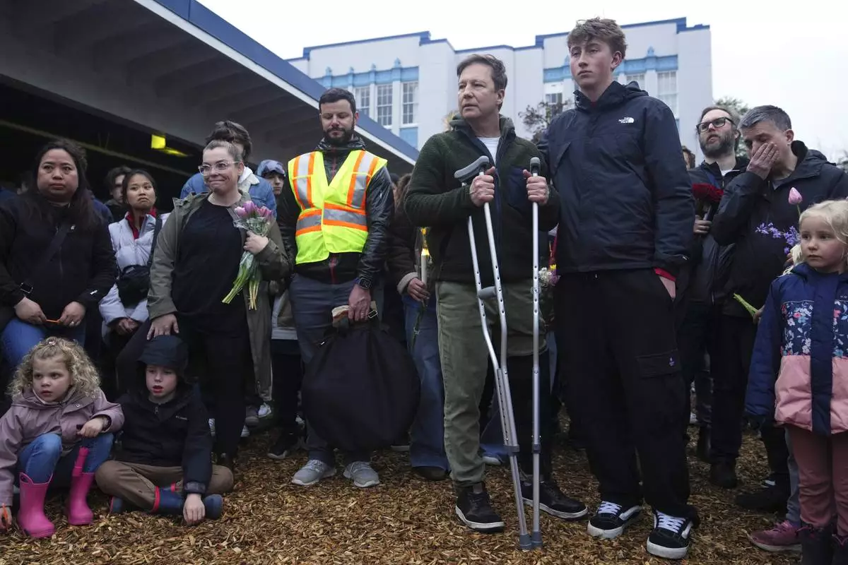 Noel Johansen, center right, whose wife Jenifer Darbellay died after a vehicle drove into a crowd during a Filipino heritage festival, and their son Ford, right, stand at a vigil outside Sir Alexander Mackenzie Elementary School in Vancouver, British Columbia, Monday, April 28, 2025. (AP Photo/Lindsey Wasson)