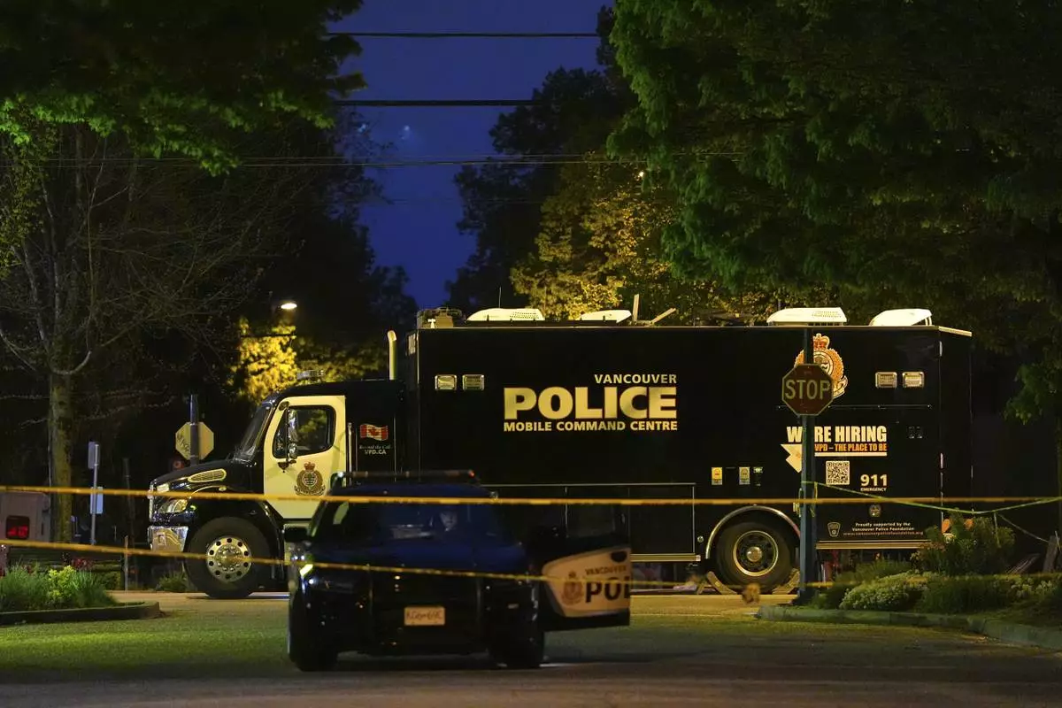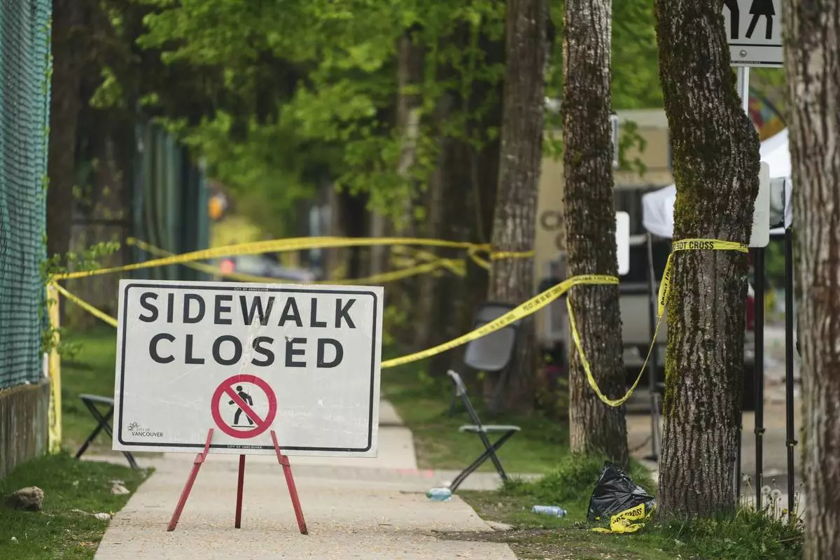 Vancouver Police officers secure a street in Vancouver, where a vehicle drove into crowd at a street festival on the night before, on Sunday April 27, 2025. (Rich Lam/The Canadian Press via AP)