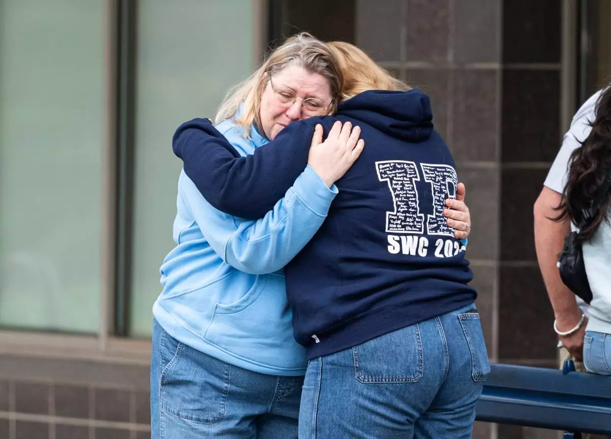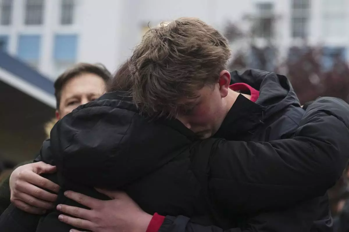 Ford Johansen, right, whose mom Jenifer Darbellay died after a vehicle drove into a crowd during a Filipino heritage festival, hugs an attendee at a vigil outside Sir Alexander Mackenzie Elementary School in Vancouver, British Columbia, Monday, April 28, 2025. (AP Photo/Lindsey Wasson)