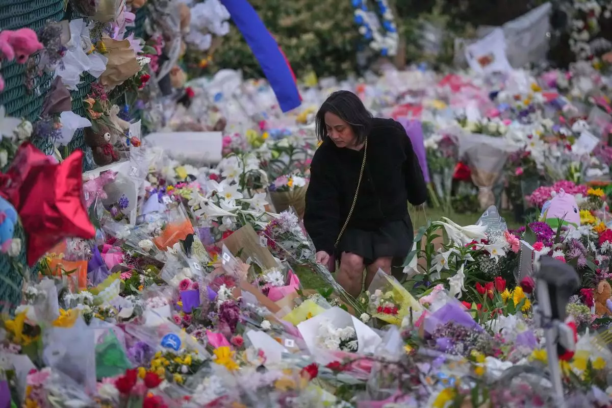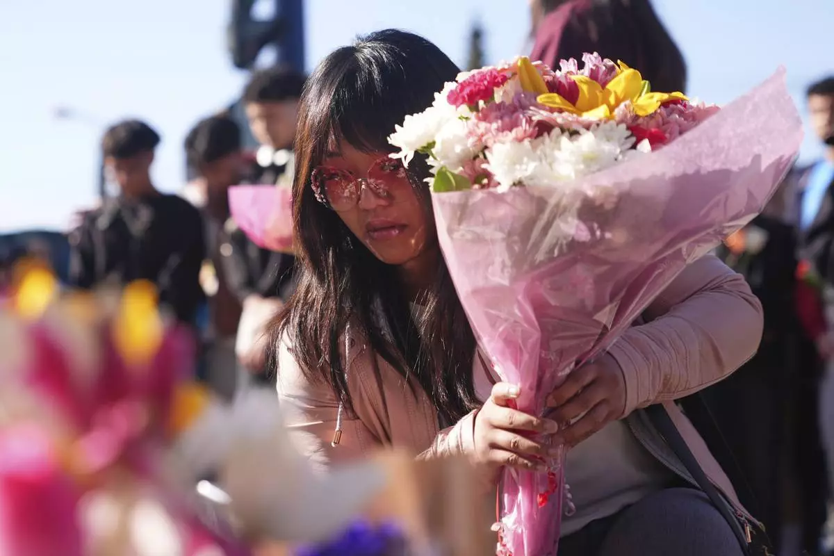 Sarah Edmilao, a member of the Filipino community who says friends had attended earlier in the day, places flowers at a growing memorial near a site the day after a driver killed multiple people during a Filipino festival Sunday, April 27, 2025, in Vancouver, British Columbia. (AP Photo/Lindsey Wasson)