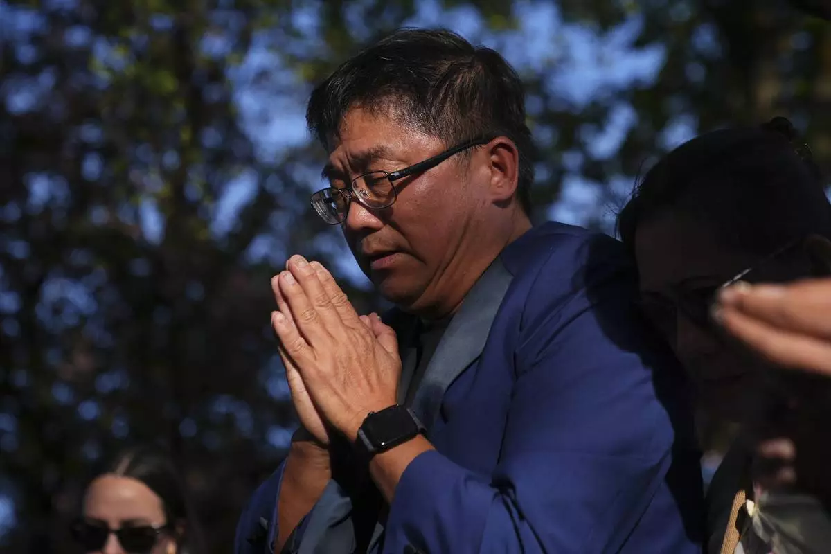 Vincent Meng prays at a vigil after a vehicle drove into a crowd during a Filipino heritage festival in Vancouver, British Columbia, Sunday, April 27, 2025. (AP Photo/Lindsey Wasson)